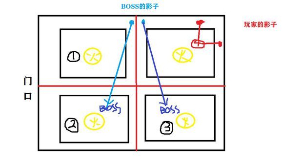 BOSS的影子会由对面的火盆投影过来,所以一号火盆后墙上的影子必然是由二号点的火盆投影过来的,所以BOSS是站在三号点上,同理四号火盆墙上的影子,BOSS就一定在三号火盆的蓝点上。