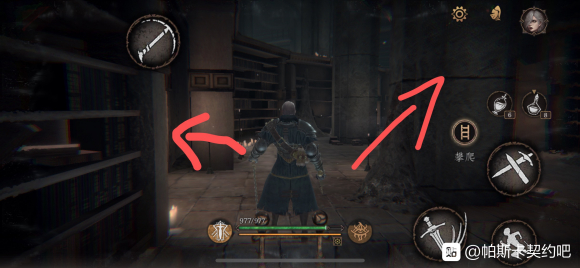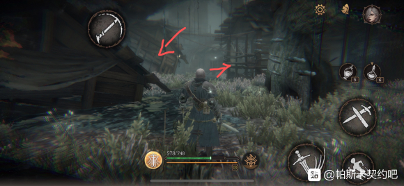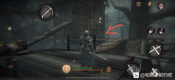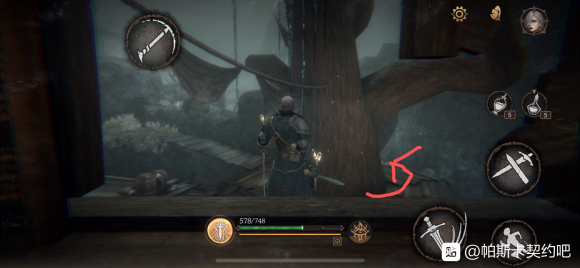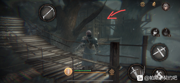 3,横梁层落脚点往左,出小门连接外部村庄,一直往下去往沙漏获取地点。走过第一根横梁往上,到达坠灯层,也就是图书馆下面。