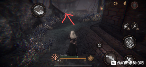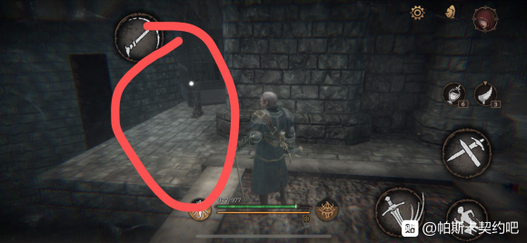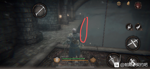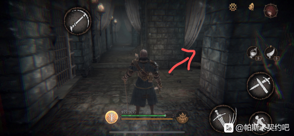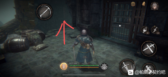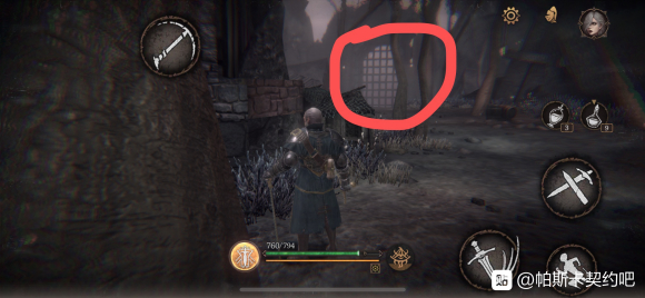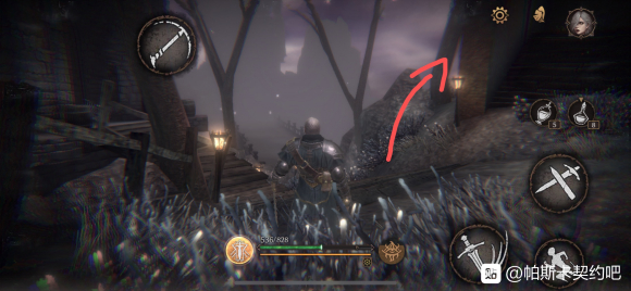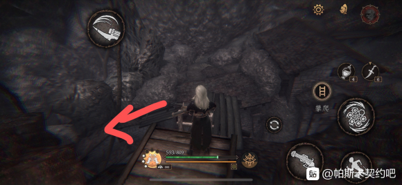 3,往前走以后,对面修女那里上楼,两个修女这里的铁门在找到黑精后,它会帮忙打开,到达女巫对狙那里,往左到达濒死修女处。图4所指。