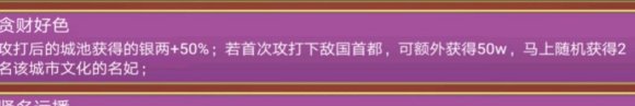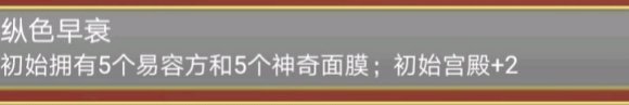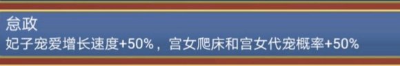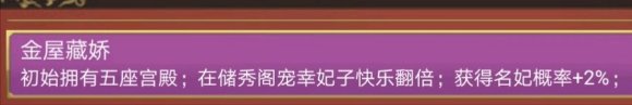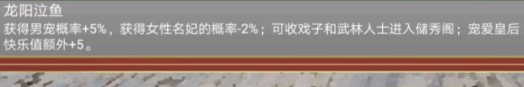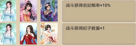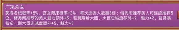 像加珍宝个数、异象概率这些和五行一样的,但5%名妃率、临幸妃子魅力+1、战斗获得妃子+1(配合霸王必获)就很绝了