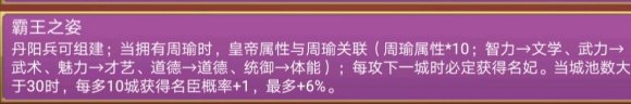 霸王之资(长沙桓王),如果有东吴四英杰,带上周瑜,全属性900+,配合广采众女给周瑜送几个娇娇脸名妃,才艺值直接1200。12%的名妃率,它不香嘛
