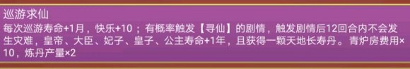 巡游求仙(秦始皇),加寿命是随机的用处不大,重要的是天地长寿丹!如果宠妃年纪轻轻就寿终既不是很伤,这时候囤的天地长寿丹就派上用场了。一颗加16个月寿命,有事没事sl一下,我一局囤了50几颗,硬是把26岁寿终的凤凰留到退位