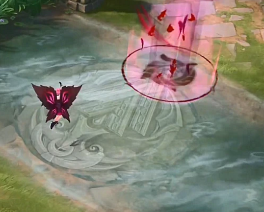 然后是二技能,这是一个控制技能,可以把敌人击飞,图片中看到这皮肤的特效想当帅气,从下方升起一团红色光效,而且里面还有好几只小蝴蝶在飞,看起来完全不像是6元品质。