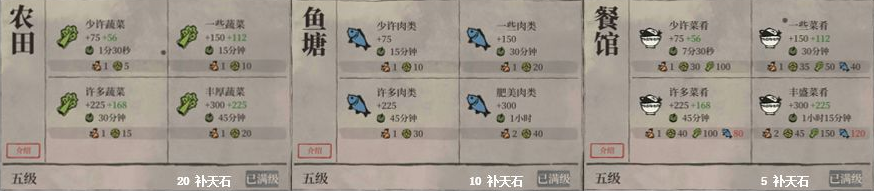 这也需要生产食物的两个原材料能跟上餐馆的进度,农田和鱼塘,自行考虑是否升满级。