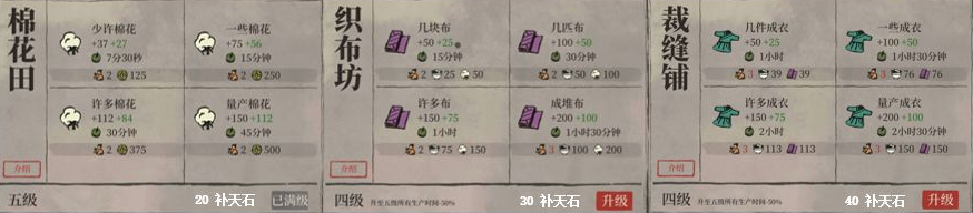 开局一个民宅能提供 1 个特殊居民和 2 个普通居民,劳力的唯一来源。等有成衣以后优先将所有民宅升到满级,居民数量可以翻一倍,极大缓解你的用工压力。繁荣度越高,你能建造的民宅越多。