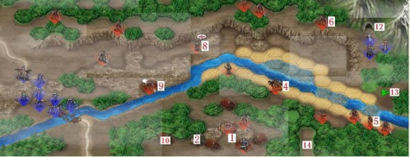 记得图中迪安和NPC祭司位置调换!我之前是考虑到省人就让祭司帮忙堵,后面才发现不好,因为后面会出来弓骑兵在桥右边,这祭司发现沃德掉血就加血,然后护卫消失,我读档2次,最后祭司剩了3血撑过去了。