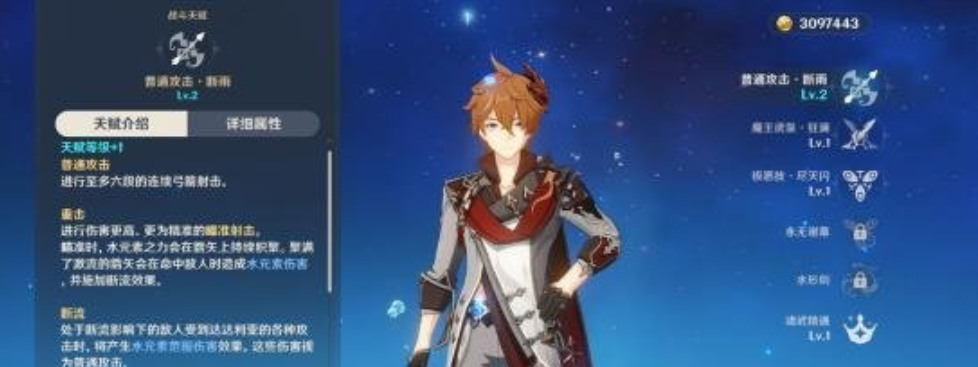 普攻·断雨:进行6段连续的弓箭射击,常规输出手段,重点是蓄力重击—进行一次精准的瞄准射击,瞄准时,水元素之力会在箭矢上持续积聚,对敌人造成水元素伤害并附加断流效果;