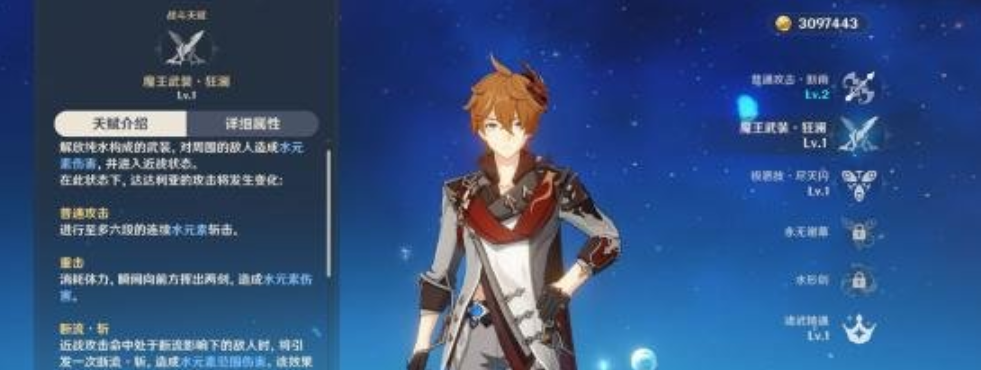 元素战技·魔王武装·狂澜:解放纯水结构的武装,对附近敌人造成水元素伤害,并进入近战状态,近战状态下的所有普攻重击皆视为水元素伤害,并且攻击处于断流效果下的敌人,将引发一次断流·斩,造成水元素范围伤害;