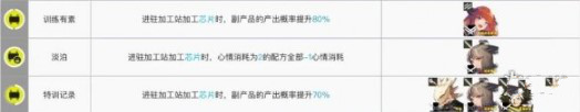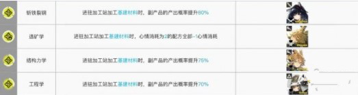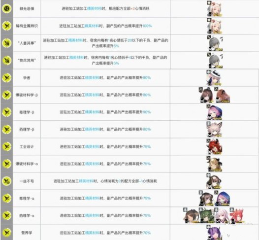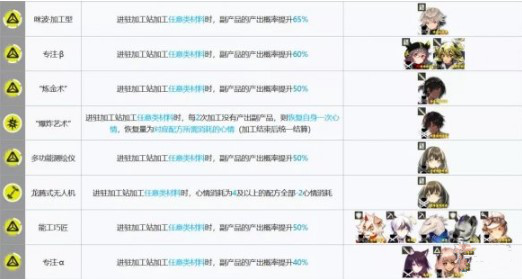 这一类新的加工站干员的特色是:在加工指定某个系列的材料时,拥有着超高的加成,且会降低心情消耗。是目前的最优解。如果未来有更多这种类型的干员上岛,会直接导致任意类材料加工干员下岗。