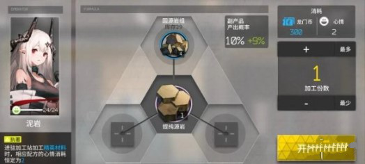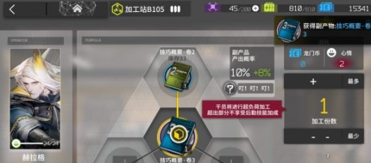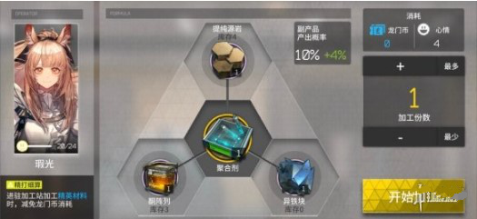 在加工站里的干员辅助下,合成材料时有一定的概率产出“低一档”的材料。
