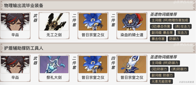 辛焱没有治疗,没有充能手段,因此沙漏部位选择充能效率也是可以的,但更多情况下一直堆防御保证护盾量即可。这里推荐宗室是因为宗室是唯一相性尚可的辅助系圣遗物套装,如果有特殊需求的阵容可以换成教官套等其他辅助圣遗物,套装效果无硬性要求。