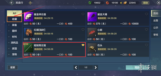 如果实在找不到想要的物品,可以去公示栏中看看,每个新物品上架,都会有5分钟的公示期,防止物品错挂或者被秒。公示期内玩家可以通过一口价进行预购,最多有30个玩家可对同一商品进行预购,公示期结束后在参与预购的玩家中随机抽取一个玩家成交。