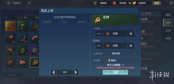 商品上架时,卖家可以选择物品的一口价和起拍价,起拍价不能高于一口价。同时,为了防止黑心卖家,每种物品都会有价格上限,并不能将商品挂的无限贵。卖家也可以选择上架时常,选择的上架时长越长,拍卖行收取的手续费就越高。