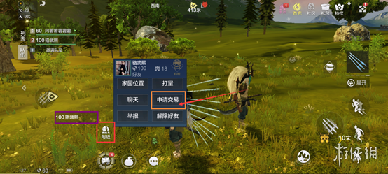 两位旅者见面之后,会出现一个附近标志。在附近列表中选择你要与之交易的旅者ID,并选择申请交易。