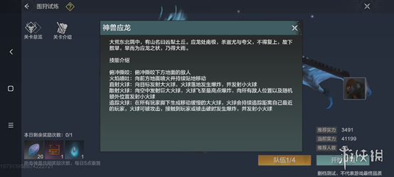 摆放好之后,有一个【入画】按钮,点击就能进入围狩图页面。在围狩图页面有四个等级不同的巨兽,分别是应龙,狌狌,萤皇和颙鸟。神兽强度随神兽开放等级提升,等级越高,奖励也越好。在页面左上角有关卡介绍,建议各位旅者进入前先看看技能介绍。