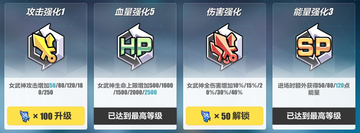增益效果分为全部女武神通用和女武神专属两种,女武神出战时只会抽取到自己的专属增益,同时,女武神专属增益效果也只会在相应的女武神出战时被触发。