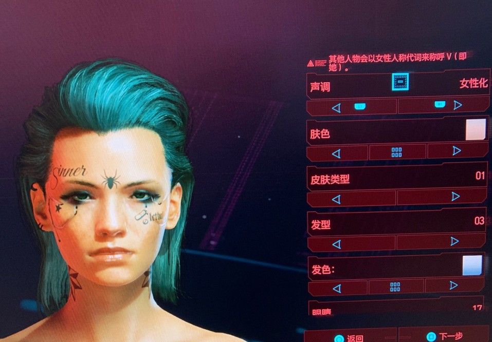 RPG游戏从创建角色开始,在E32018演示中,玩家角色的名字和姓氏都显示为“未知”,只知道角色的别名是“V”,这个V就是我们在2077操纵的角色。我们可以选择性别男或者女,当然两个性别的配音演员是不同。然而,为了更好地表达世界的超人类主义本质,当你选择了性别之后,可以选择男性的脸或者女性的脸。而且还可以单独选择男性的声音还是女性的声音。
