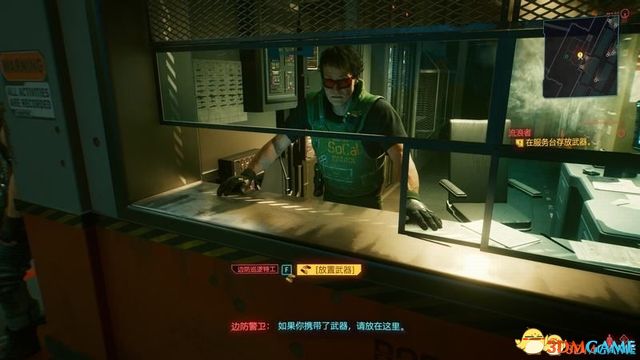 走进边防大楼,对着窗口柜台按F放上武器,记得离开时也要回来拿。
