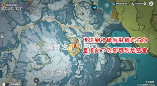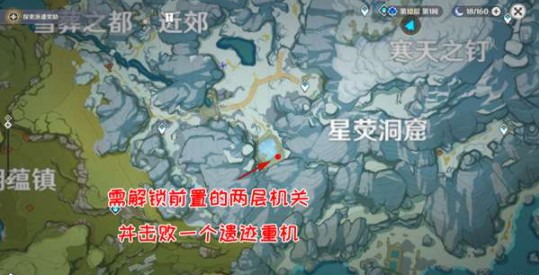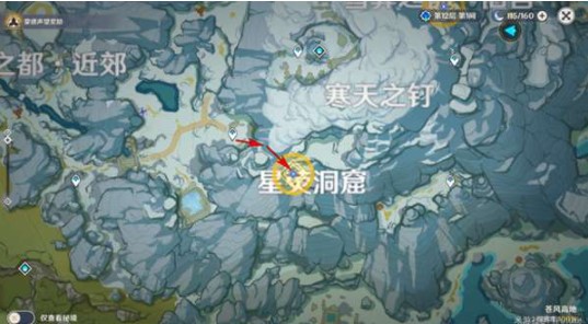 任务位置及路线如图所示,传送到图示传送锚点后,顺着地图指引向下飞,可以直接飞过去(在洞穴里)。