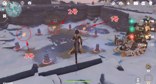 第一层解锁完成后,下面是第二层机关,这次是6个遗迹之烛和3个仙灵,3个仙灵触发后均为顺时针旋转,经过的遗迹之烛会被短暂触发。那么可以看出,要想让6个遗迹之烛在某一时刻同时亮起,关键就在于要使这3个仙灵在移动时等距且平分整个圆的周长。这里给仙灵编号,方便与后面的配图结合查看。