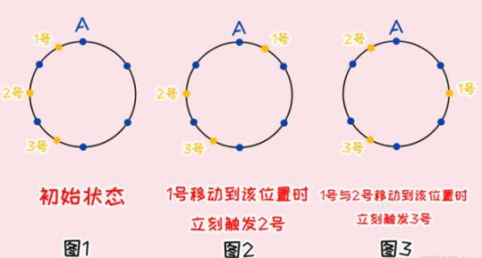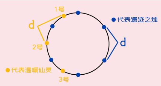 那么上述条件就变成了让3个仙灵移动时,两两之间保持2d的距离,即可解锁全部遗迹之烛。结合下图说明机关解锁流程: