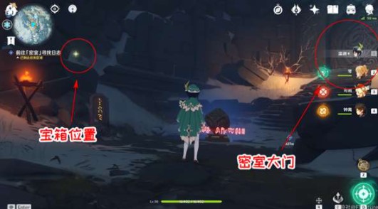 根据小地图指引,来到「密室」所在的位置,具体位置及路线如图所示(任务进行时选择追踪目标会有非常明显的方向以及距离提示,很好找)。