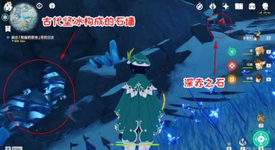 沿路线飞进洞穴,就在快要接近任务点时,会看到一面古代坚冰构成的墙,任务点就在墙后,深赤之石也在其不远处,可以轻松拾取并融化。