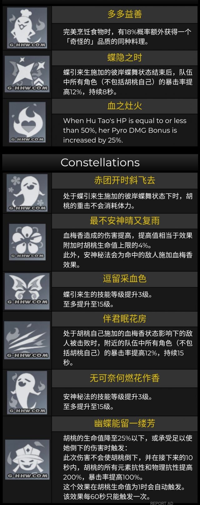 天赋二:蝶引来生施加的彼岸蝶舞状态结束后,队伍中所有角色(不包括胡桃自己),暴击率提升12%,持续8秒