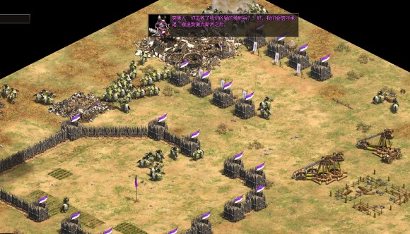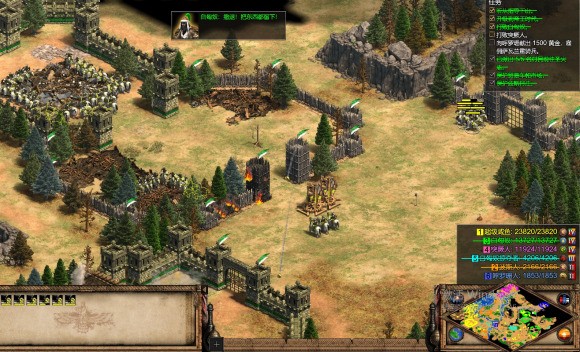 差不多交了两次黄金后我们就准备进攻,建议先从南部开始拆,因为南部黄金很多,占据金矿后我们基本上就没有压力了。家里记得屯一些游侠,再起个城堡,防止敌人偷家。一开始敌人会疯狂反扑,我们就硬顶,记得保护好投石机,反复几波后敌人的攻势就会衰弱下来了。顺便把掠夺者(青色)也灭了。