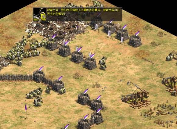 这一关我们的战术是游侠搭配投石机,白匈奴(绿色)和突厥人(紫色)的主要战术都是轻骑兵配合骑射手还有攻城武器,只有游侠可以有效应对他们,其他兵很容易被风筝,矛手也不好对抗轻骑兵。