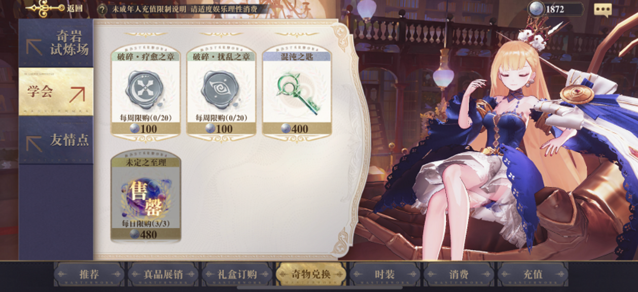 未定之至理是在学会中换取的,一天只能换取3个。一个需要480个学分。