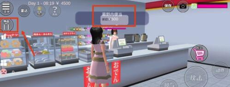 3、到便利店后,点击红色购物车即可买东西。