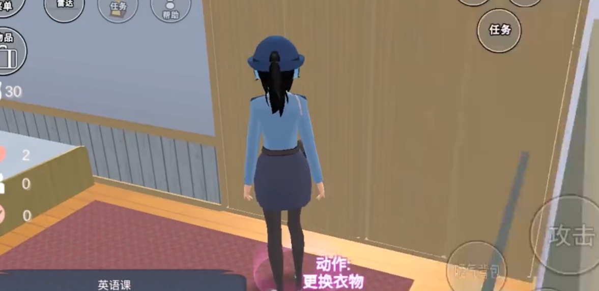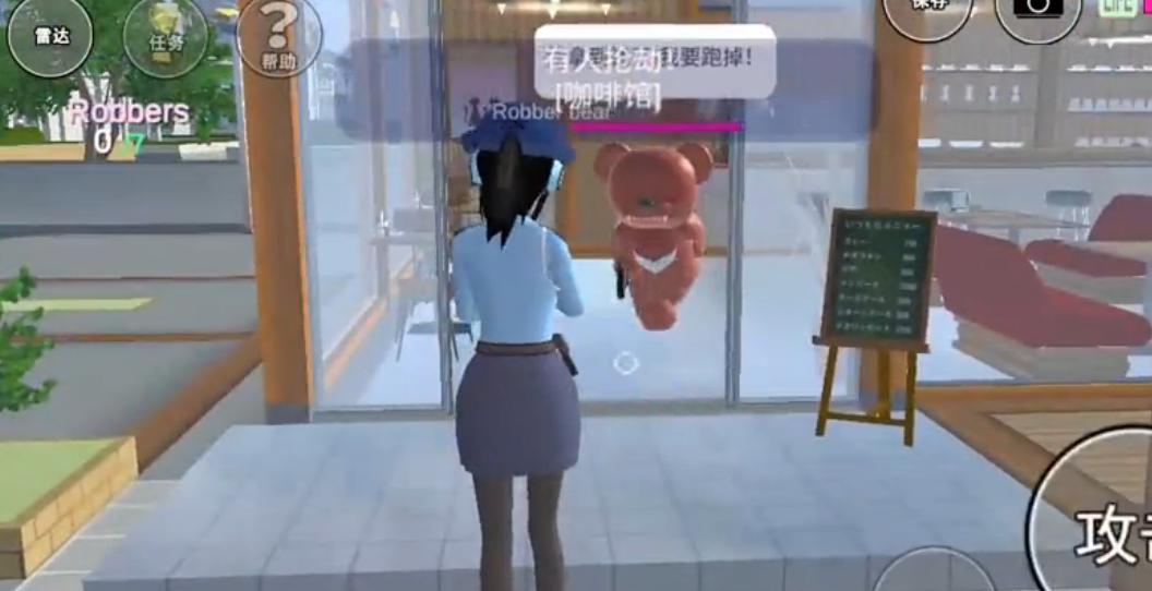 1、在樱花校园模拟器中,玩家换上警服之后,过一会在右上角就会出现任务了,点开任务后会知道强盗熊在抢劫,打败他后就可以获得金钱;