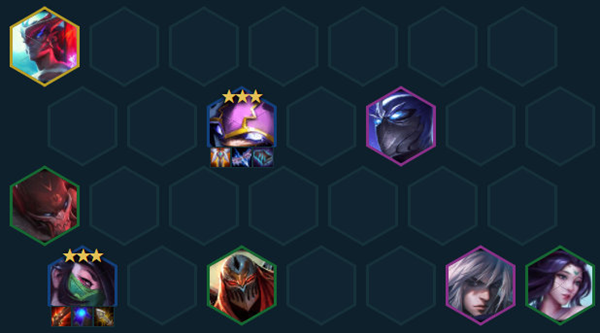 阵容的后期运营分两步走。在上7人口以后不要All in,卡着利息搜牌,在7人口D2费卡的概率是35%,3费卡的概率是30%,是D中费卡的最佳时机。这个阶段D牌不仅仅可以把阵容的2费卡的质量尽量补高,还有机会追出阿卡丽、凯南两张主核牌的三星。但是这个阵容后期也依赖4、5费卡的成型,所以不能在7人口花太多的钱,卡着利息搜牌是经济最大化的一个方式。这个阵容一般不上9,实际上不挂永恩7人口就算成型了,上8以后可以尽早All in找牌,经常玩刺客体系的人都知道刺客进入大后期以后是比较被动的,所以玩刺客尽量加快节奏、打质量优势,在8人口有35%的搜3费卡的概率,是最容易追出三费卡三星的一个阶段,8人口还有机会出永恩、慎等宗师牌进一步增加忍刺体系的质量。
