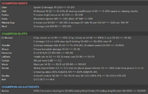 蒙多:Q技能命中后的生命返还 40% >>> 50%;Q技能击杀后的生命返还 80% >>> 100%;E技能的生命值损耗 25-65 >>> 20-60;E技能的伤害 最大生命值的3%-5% >>> 4%-6%;R技能提供的治疗量 最大生命值的50%-100% >>> 50%-110%