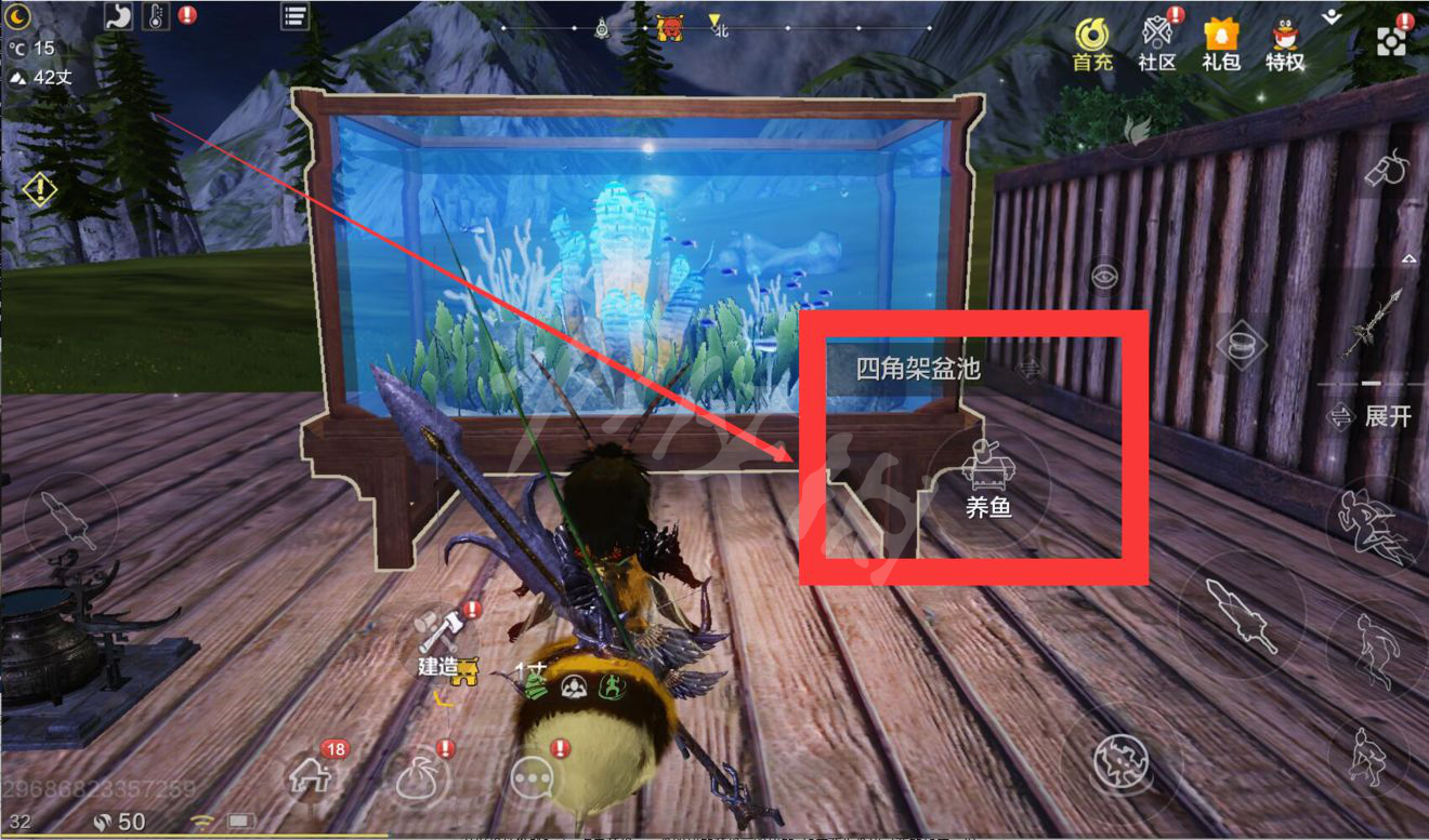 之后我们就可以回到家园,使用鱼缸,点击【养鱼】。