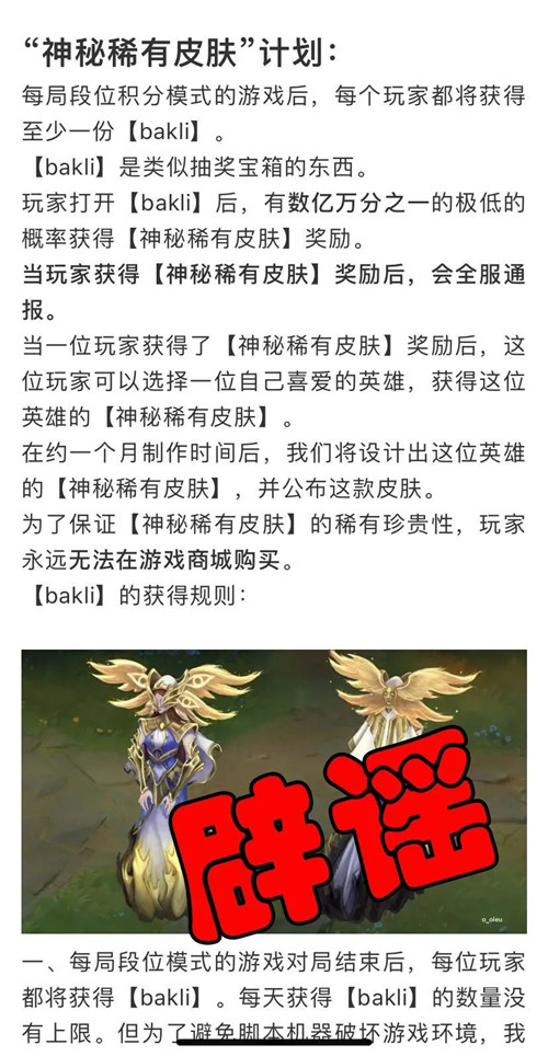 今天重点来辟个谣,从昨天晚上开始陆续收到很多小伙伴的咨询消息,说是有一个“神秘稀有皮肤计划”的东西,说是什么通过段位积分能获得开皮肤的箱子啥的,还有没见过的那种皮肤模型图,说实话我不知道具体是从哪传出来的,有小伙伴给我截图,看到的平台都不同,有贴吧,有公众号,有抖音等等,讲道理,这玩意传得太过分了点,正儿八经的无中生有。