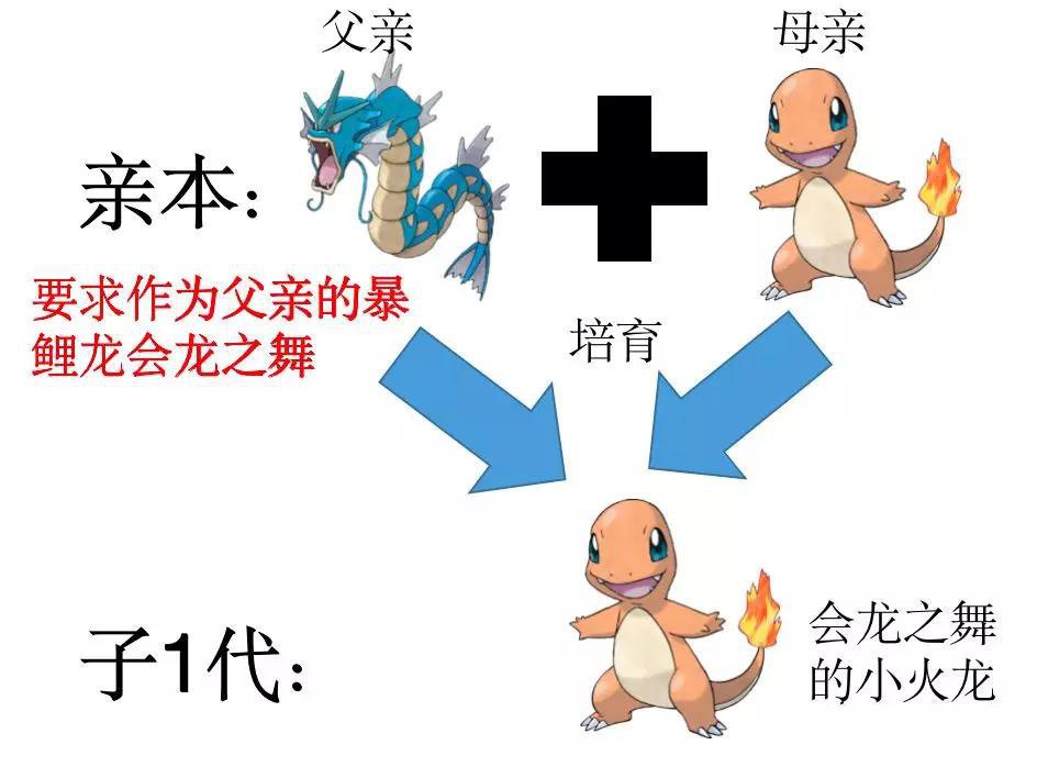 上面的例子还不过瘾,那给大家来个更复杂的,例如我们想培育一只会龙之舞的喷火龙,但是发现它并不能学习龙之舞,但是蛋招式或是遗传招式显示小火龙可以学习,那要如何让小火龙学到呢?