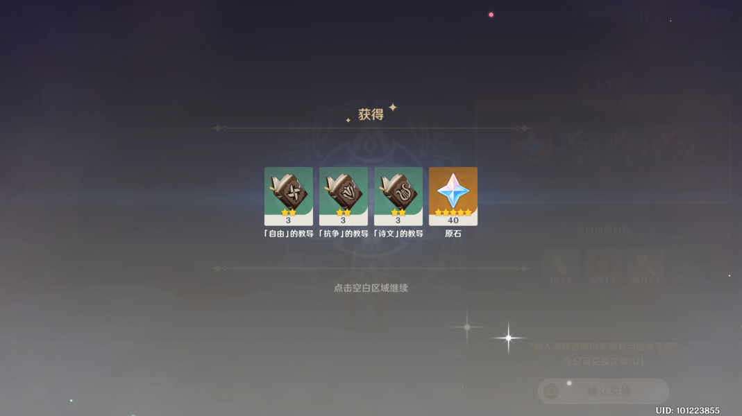 提交材料后,可获得奖励:原石*40 自由的教导*3 抗争的教导*3 诗文的教导*3。