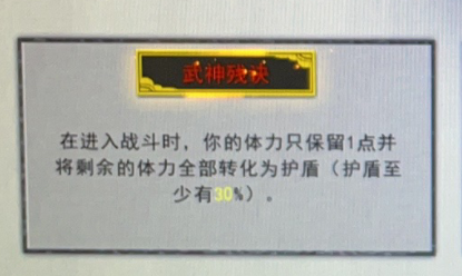 武神的具体效果是进入战斗时你的体力值保留1点并将剩余体力全部转化为护盾(护盾至少有30%)