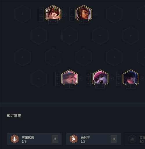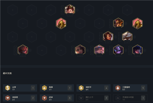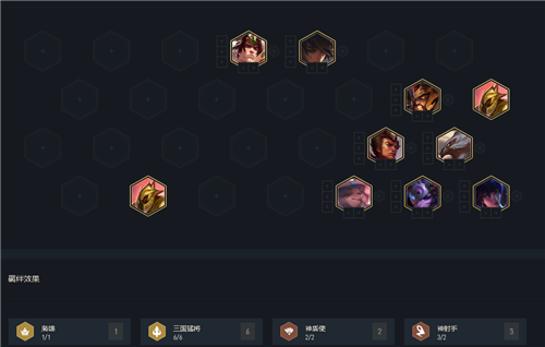 这个阵容可以用来上分还有一个原因就是不吃天选,三国任意天选,除了小炮之外的任意神射手天选都可以玩,也就是说很容易成型,成型阵容位6三国4神射,这是核心羁绊,最终大成阵容如下。