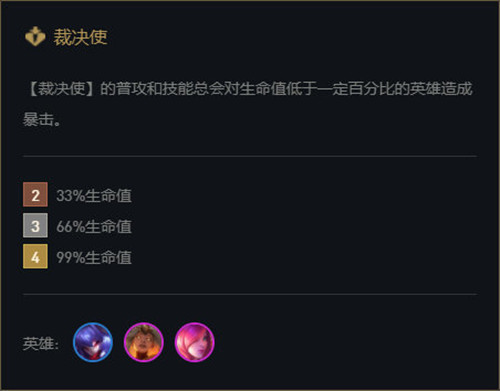 裁决使羁绊主要针对的是“生命值低于一定百分比的英雄造成暴击”。4裁决使对手生命值在99%(近乎满血)就可以稳定打出暴击。所以裁决使羁绊实际上就是针对一些残血英雄能打出稳定暴击的一个“斩杀”型羁绊。天选裁决稳定输出,3裁决稳定打斩杀。所以现在要裁决天选凑出4裁决来打性价比是很高的。因为3张裁决是3费以上,所以作为裁决不管谁上天选,单卡的作战能力都会很强。所以从3裁决转4裁决在现在版本非常必要。