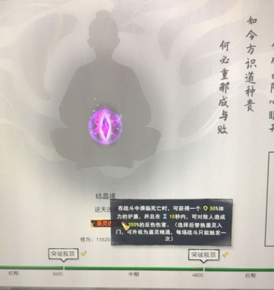 结晶期逆天改命的选择为盾灵进阶,这个天赋可以让你在打boss的时候可以苟命,并且200%的反伤也可以作为最后一搏的手段。