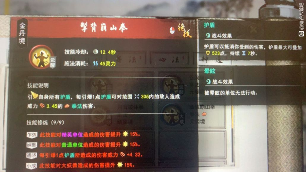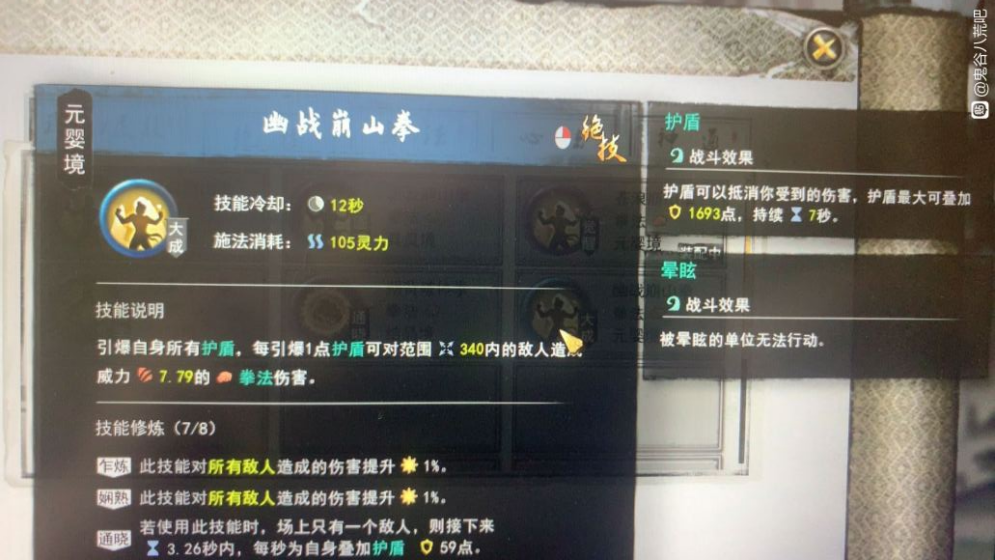有了武神残决以后,右键选择崩山拳,一次性引爆所有护盾,伤害爆表,金丹期红色功法的伤害系数是3.45,而到了元婴期,即使是普通功法伤害系数也高达8左右,伤害非常可怕