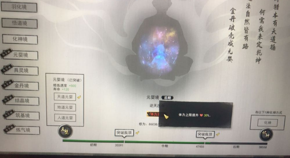 而到了元婴期,逆天改命的选择就比较多了,目前主流是选择徒手精通,可以开局放神通回血,增强续航。但是我选择了体力之树这个逆天改命天赋,效果是增加30%的血量,相当于进一步提高了伤害,也是元婴一拳秒登仙的基础