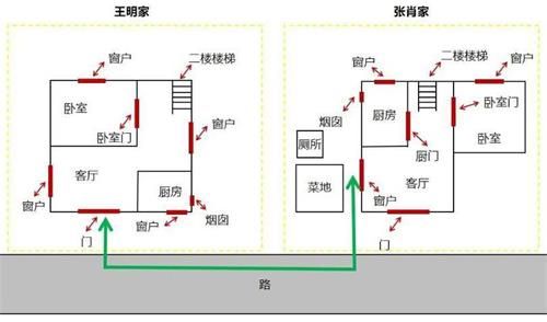 在起诉书中王明提及自己摘完菜原路返回时从窗户瞥见张肖在厨房投放毒药至锅中,可按正常情况,菜地仅在客厅窗户附近,王明急于煮面摘完菜后回家的话,理论上是只经过了张肖家客厅窗户(绿色路线),而客厅窗户因被厨房墙体挡住是无法看见张肖家厨房状况的,很明显该处具有矛盾点。
