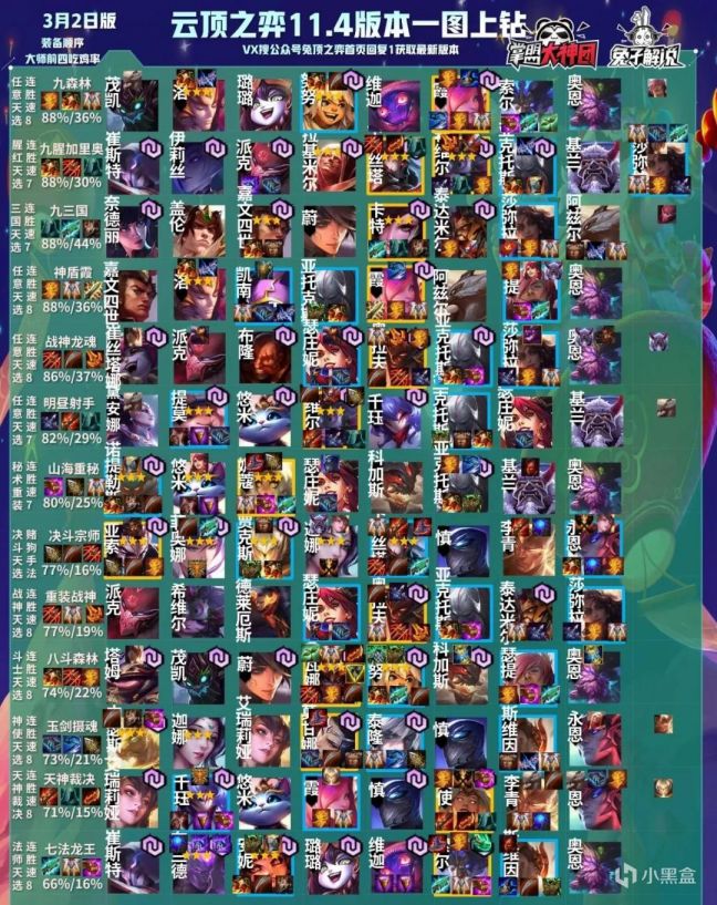 云顶之弈11.4版本阵容排行榜一览兔子重新整理了外服的排行榜,不过外服的排行榜只是某一种羁绊的最终强度排名,不包含过渡的体系,所以只是成型排行榜,并不能完全代表阵容的强度,排行榜必须要结合实际的节奏才可以。