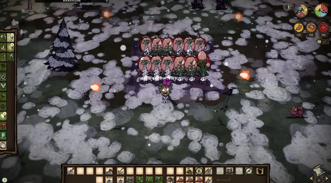 右上和左下施了6个腐烂食物(6点2号肥力,刚好满田内3株大蒜的需求)