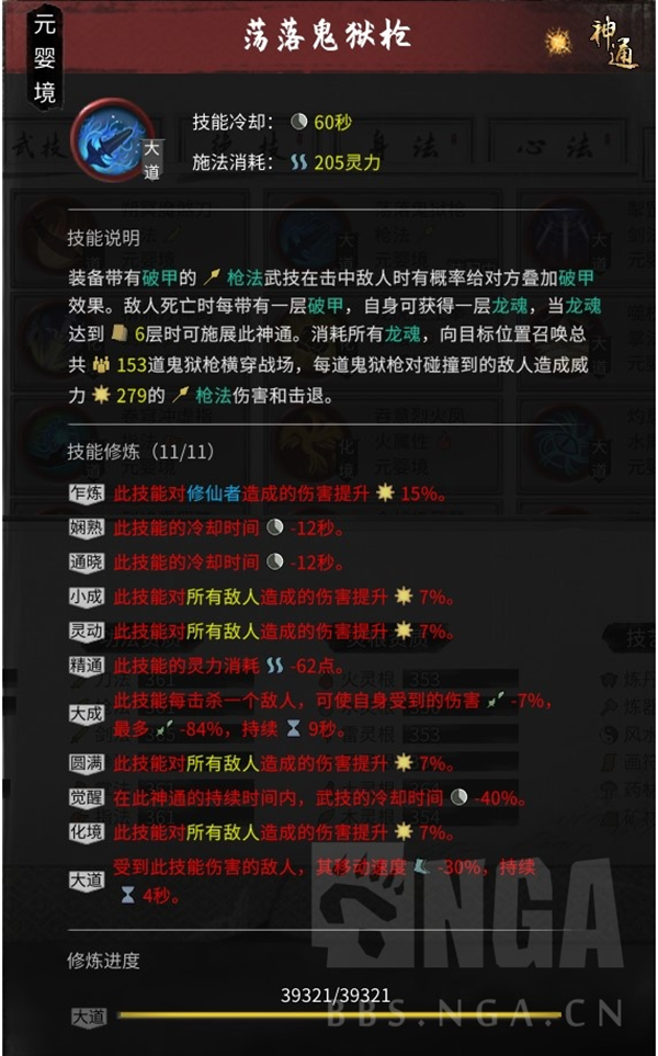 神通:这里强烈推荐用枪神通鬼狱枪代替万神剑打登仙,这个技能有-40%CD,虽然比万神的-50%少,但打登仙时在刀,指,拳有25+25+12=62的情况下,加上40就已经过100了,足够把绝技换成寒霜掌,而这招自带击退,持续时间也比万神剑要长3秒左右,打登仙时非常好用,尤其配合排云掌的话,不带盾的登仙根本进不了身都是随便打。(注意这招有个武技带70%击退的词条最好不要带,太影响输出)。
