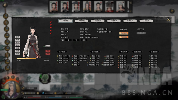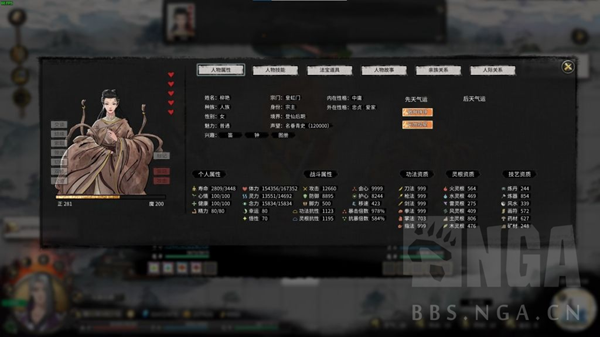 先贴小修改后的60年状态,不改要肝出全修来吃宗门果子刷蘑菇怕要上百年吧,至少拳,掌,剑/枪,指,风,水,雷这几个关键都要把资质肝到300左右,词条都肝满更是几乎不可能的任务